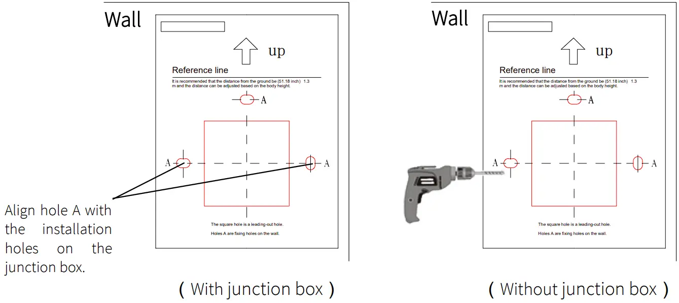 • With junction box: Align the two holes (A) on the drill template with the two installation holes on the junction box. See the left figure below.
