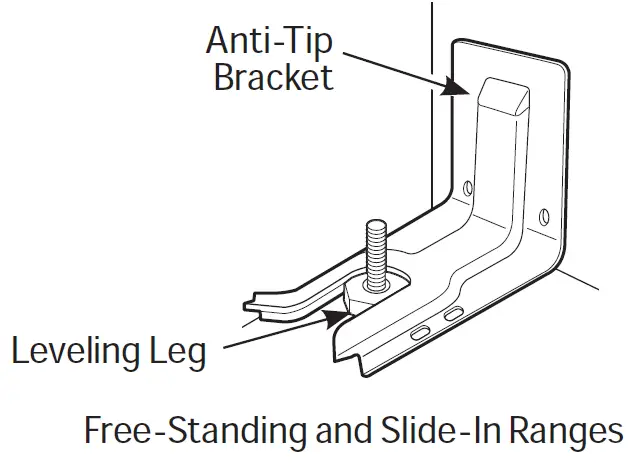 range to see that the rear leveling leg is engaged in the bracket. On some models, the storage drawer or kick panel can be removed for easy inspection. If visual inspection is not possible, slide the range forward, confirm the anti-tip bracket is securely attached to the floor or wall, and slide the range back so the rear leveling leg is under the anti-tip bracket. If the range is pulled from the wall for any reason, always repeat this procedure to verify the range is properly secured by the anti-tip bracket. Never completely remove the leveling legs or the range will not be secured to the anti-tip device properly. To reduce the risk of tipping the range, the range must be secured by a properly installed anti-tip bracket. See installation instructions shipped with the bracket for complete details before attempting to install.