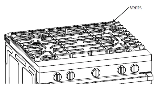 - Never block the vents (air openings) of the range. They provide the air inlets and outlets that are necessary for the range to operate properly with correct combustion. Air openings are located at the rear of the cooktop, at the top and bottom of the oven door, and at the bottom of the range under the warming drawer, lower oven drawer or kick panel.