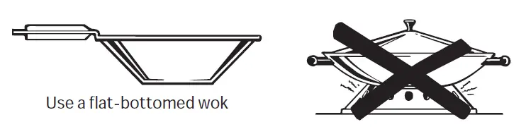 - Do not use a wok with a round metal support ring. The ring may trap heat and block air to the burner resulting in a carbon monoxide hazard.