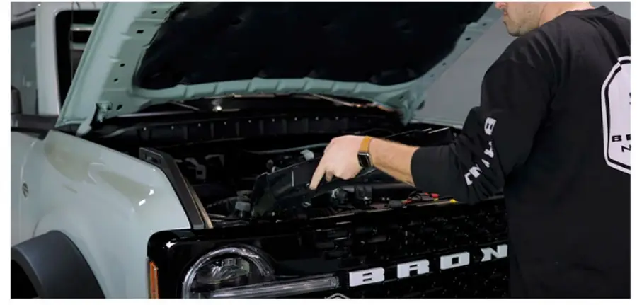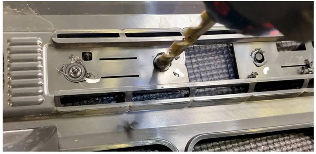 With the grill now removed you can drill out the plastic rivets holding in the factory letters. Using a 1/4″ drill bit drill out the (2) melted plastic rivets onthe BACK side of each letter. The original letters will simply drop out once the plastic is removed.
