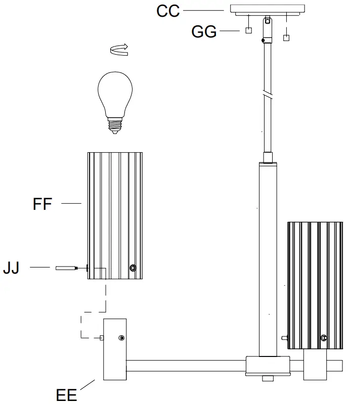 - Install glass shades (FF) onto each socket of the main fixture body with decorative screws (JJ).