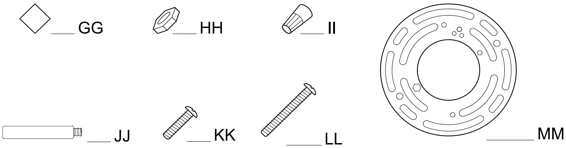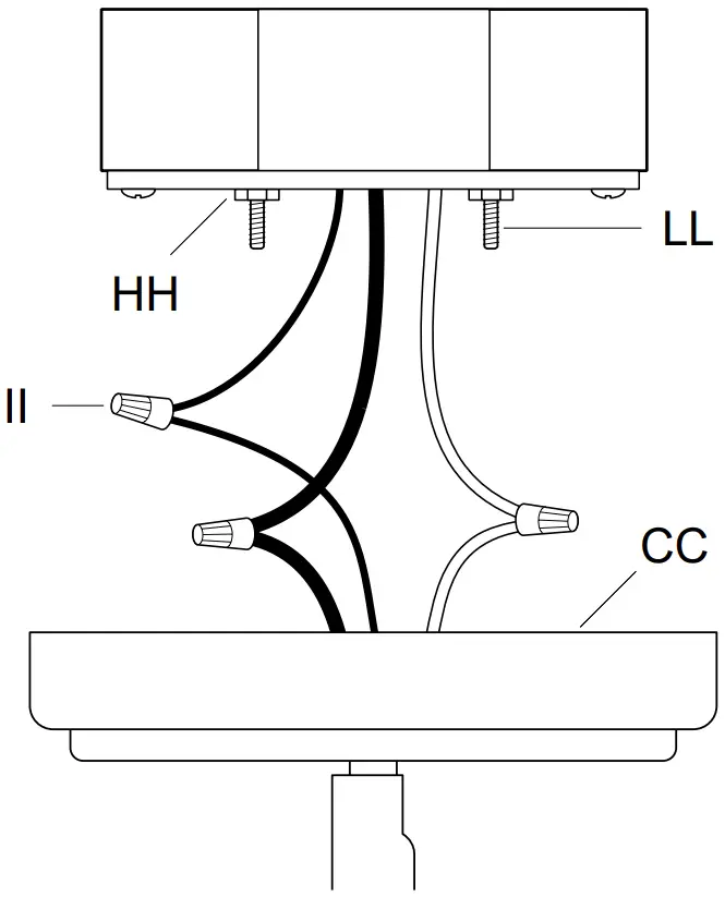 - Place the canopy (CC) over the fixture screws (LL) and secure the canopy (CC) with the decorative nuts (GG).