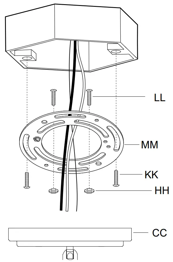 - Place the canopy (CC) over the outlet box and onto the fixture screws (LL).