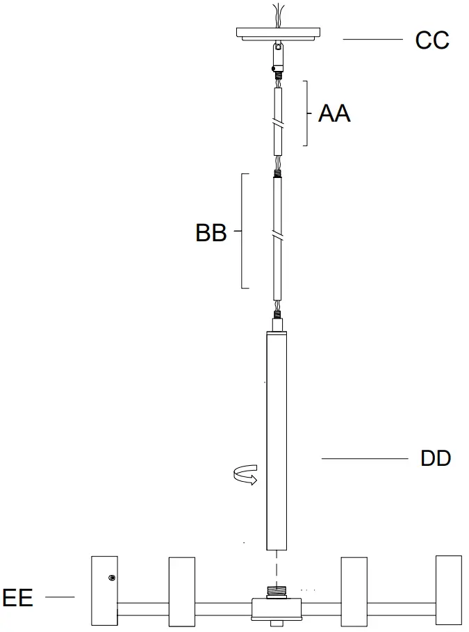 - Feed the fixture wires from the main fixture body (EE) through the central post (DD), tubes (AA & BB) and through the canopy (CC).