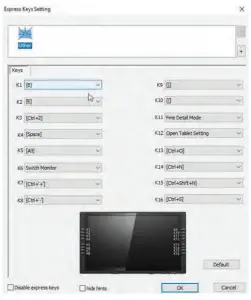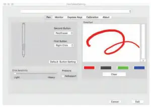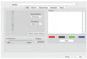 Pressure No Support function can disable pen pressure when drawing. Click “Default Button Setting” to revert to manufacturer settings.