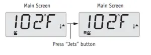 Press the “Jets” button once to turn pump 1 on or off, and to shift between low and high speeds if equipped.