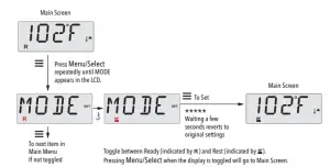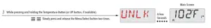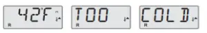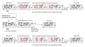 This system incorporates two temperature range settings with independent set temperatures. The High Range designated in the display by a thermometer and an “up” arrow, and the Low Range designated in the display by a thermometer and “down” arrow.