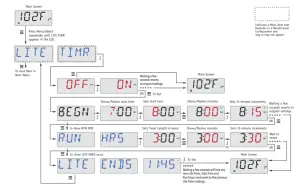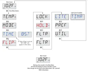 Navigating the entire menu structure is done with 2 or 3 buttons on the control panel. Some panels have separate WARM (Up) and COOL (Down) buttons, while others have a single Temperature button. In the navigation diagrams