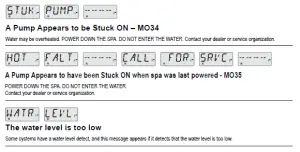 As soon as the above display appears on the panel, push the “Jets” button once to start Pump 1 in low-speed and then again to switch to high-speed. Also, push the “Jets 2” or “Aux” button, if you have a 2nd pump, to turn it on. The pumps will now be running in high-speed to facilitate priming. If the pumps have not primed after 2 minutes, and water is not flowing from the jets in the spa, do not allow the pumps to continue to run. Turn off the pumps and repeat the process. Note: Turning the power off and back on again will initiate a new pump priming session. Sometimes momentarily turning the pump off and on will help it to prime. Do not do this more than 5 times. If the pump(s) will not prime, shut off the power to the spa and call for service.