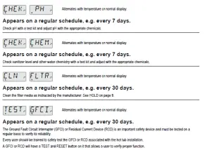 - Test the ground fault circuit interrupter or residual current device before each use of the spa.