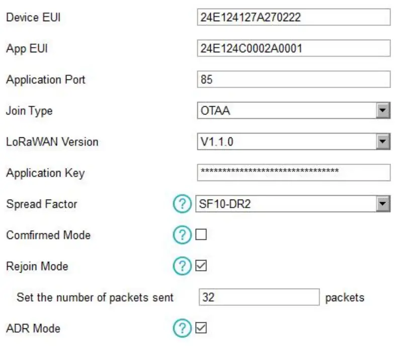 | Application Key | Appkey for OTAA mode, default is 5572404C696E6B4C6F52613230313823. |