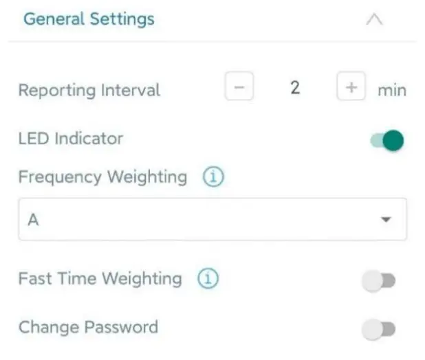 ff03b004 Channel Type Value ff 03 (Set Reporting Interval) b0 04 => 04 b0 = 1200s = 20 minutes - Set weighting mode to A-weighting and disable fast time weighting.