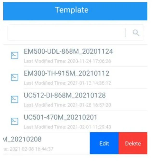 - Select one template file that is saved in the smartphone and click “Write”, then attach it to another device to write the configuration.
