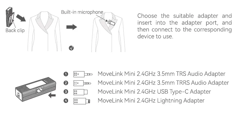 Install the transmitter on the collar through the back clip, a1m1ng the built-in microphone towards the sound source direction. Please do not cover the built-in microphone in order to get good sound effects. Choose the suitable adapter and insert into the adapter port, and then connect to the corresponding device to use.