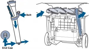 - Replace the Brush Roll and Belt by looping the Belt over the motor shaft and the Brush Roll. Line up the end caps and pull the brush forward into place. This will stretch the belt. Return bottom cover back on and replace the screws.