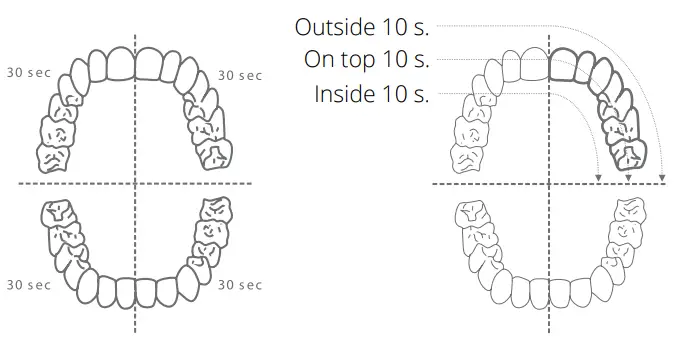 Press the switch and move the jaw up and down slightly to clean your teeth from the outside and inside. The oral cavity is divided into 4 areas and the recommended cleaning time for each area is 30 seconds. When you have finished cleaning that area for 30 seconds, the electric toothbrush will stop briefly to remind you to clean the next area.