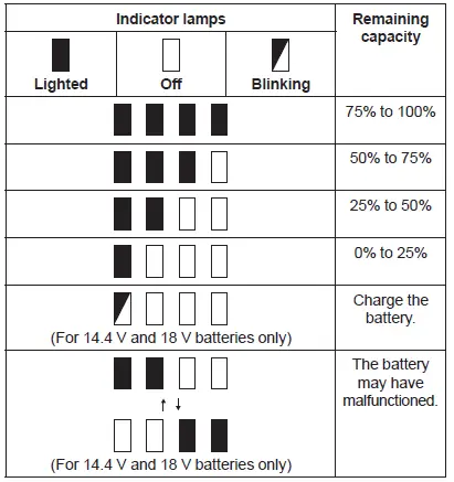 Press the check button on the battery cartridge to indicate the remaining battery capacity. The indicator lamps light up for a few seconds.