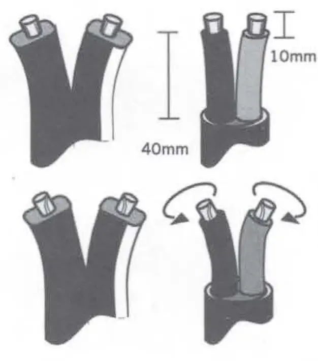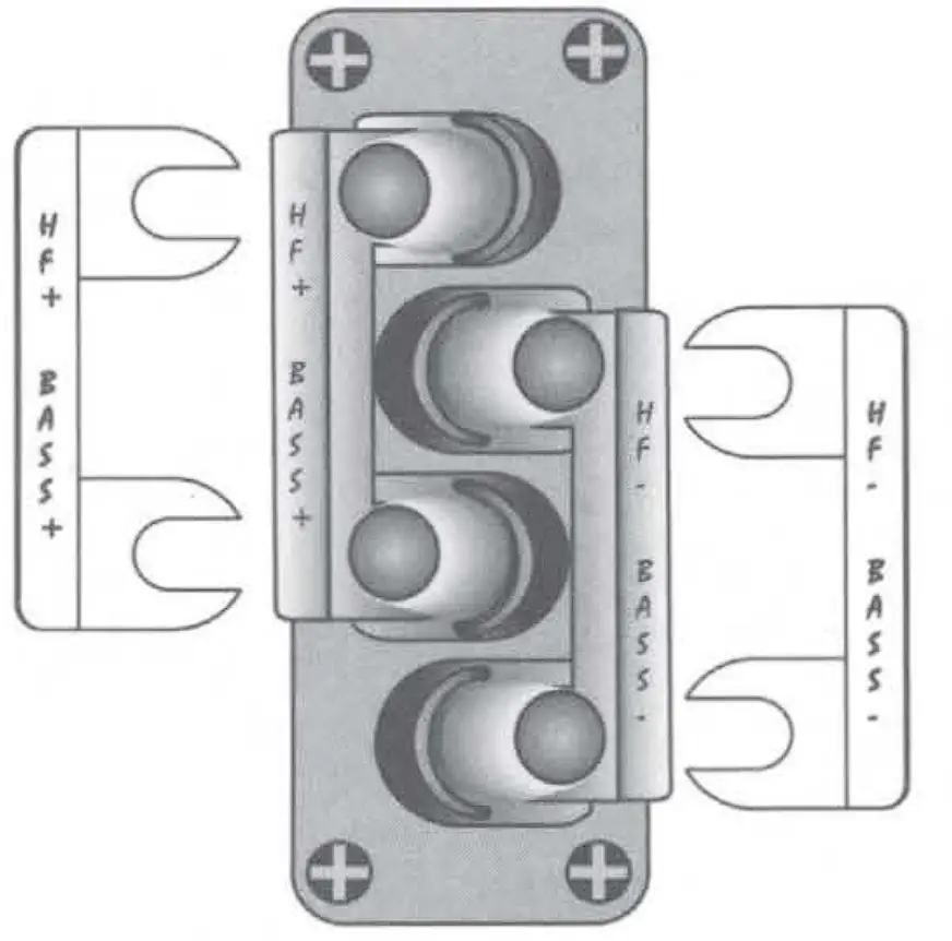 If your speakers use a special bi-wireable crossover panel with four terminal binding posts. Please follow the drawing carefully to see the correct orientation of the loudspeaker terminals. The upper terminals connect to the treble unit. the lower pair to the bass unit. As supplied, the treble terminal pair is connected to the bass terminal pair via removable metal straps. These should be left in place for standard installations.
