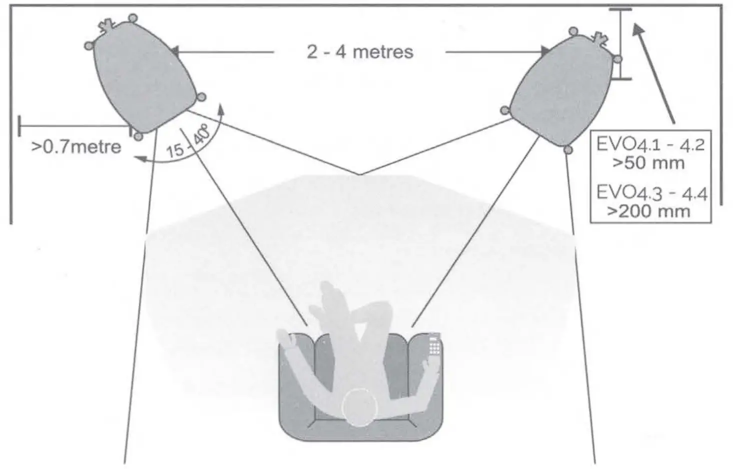 The speakers should ideally be sited 600 mm-1,5 metres above the listening position and 2,5-3.5 metres apart. central to the listener and behind the listening position. preferably on a rear wall. If the listening position is some distance from a rear wall, the speakers may be mounted on opposite side walls but always behind the listening position.