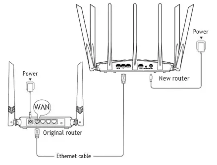 - Connect the WAN port of the original router to a LAN port (port 1, 2,