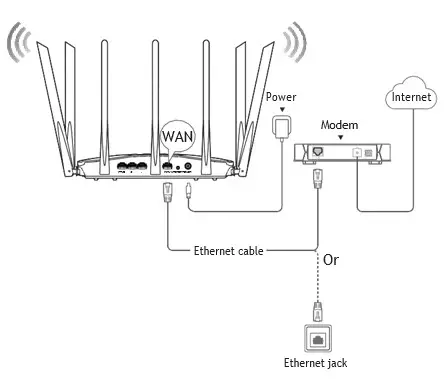 - Connect the WAN port of the new router to the LAN port of your modem or the Ethernet jack using an Ethernet cable. The