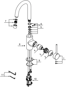 | Dripping from aerator | Washer may be missing or not seated correctly | Remove aerator (7). Make sure washer is present and seated correctly |