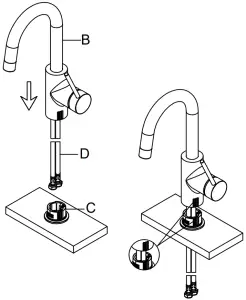 Insert hot & cold waterlines (D), one by one, into large hole of base (C). Align arrow on faucet body (B) with arrow on base (C). Attach faucet body (B) to base (C).