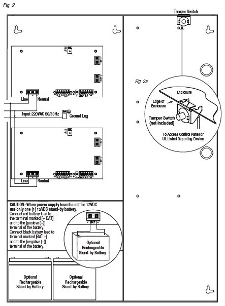 [Trigger EOL Shutdown] (Fig. 2, ). - For Access Control Applications: mount UL Listed tamper switch (Aptronics Model TS112 or equivalent) at the top of the enclosure. Slide tamper switch bracket onto the edge or the enclosure approx. 2” from the right side (Fig. 2a,). Connect tamper switch wiring to the Access Control Panel input or the appropriate UL Listed reporting device.