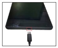 Before turning on your tablet, charge it fully. Insert the small end of the USB cable into the tablet. Insert the larger end into the charger and plug it into an outlet.