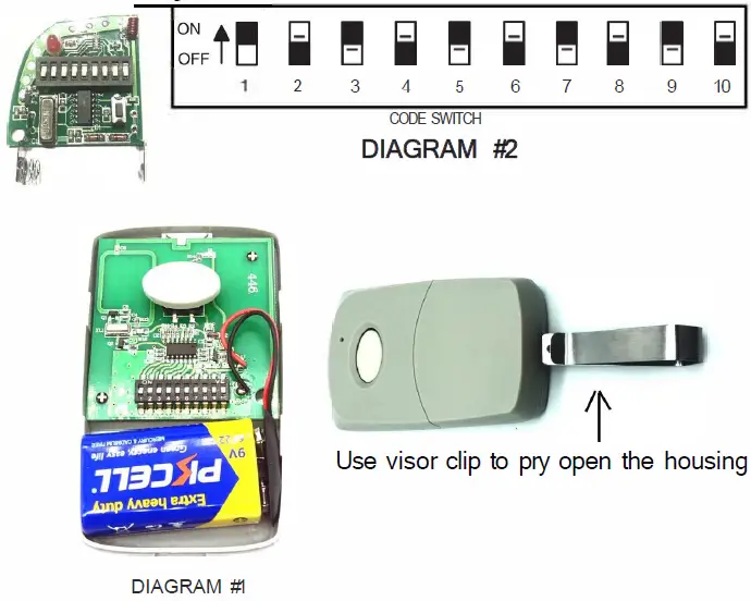 The model MC 300 Mini-Transmitter case is composed of 2 halves which are held together by a small phillips head screw. Removing this screw will allow access to both the code setting switch and the battery compartment. (see diagram #1)