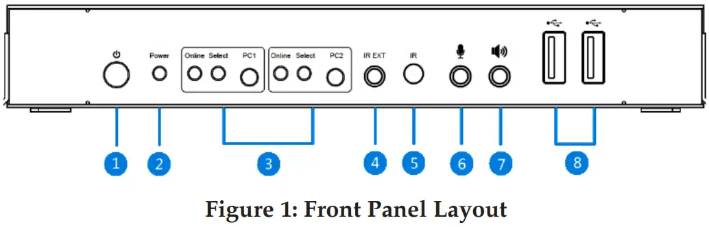 PC1 & PC2: Source device selection button Select LED (PC1 & PC2): On – the corresponding PC is selected; Blinks – Auto-switching mode is enabled Online LED (PC1 & PC2): On when USB port is connected to the corresponding PC - IR Ext: Connects to the included IR Receiver cable. Receives signals from the included remote control