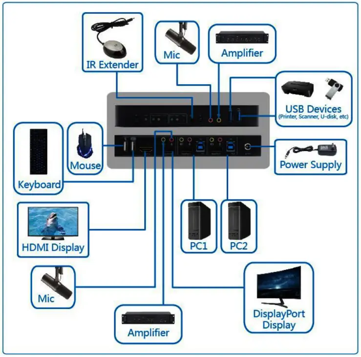 - PC2 Inputs: Connects to PC2’s DisplayPort output, USB 3.0 port, microphone input jack, audio output jack