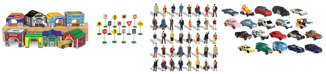 Search for toy cards, miniature people, signs, buildings, and trees.