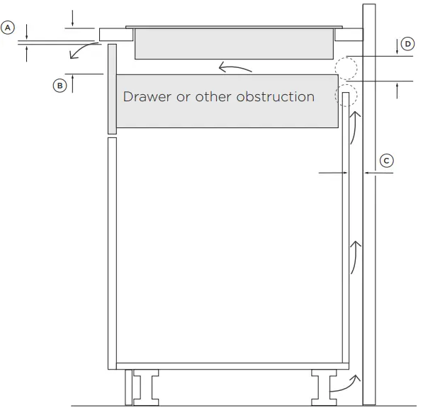 B Minimum clearance from cooktop to drawer or other obstruction: 75