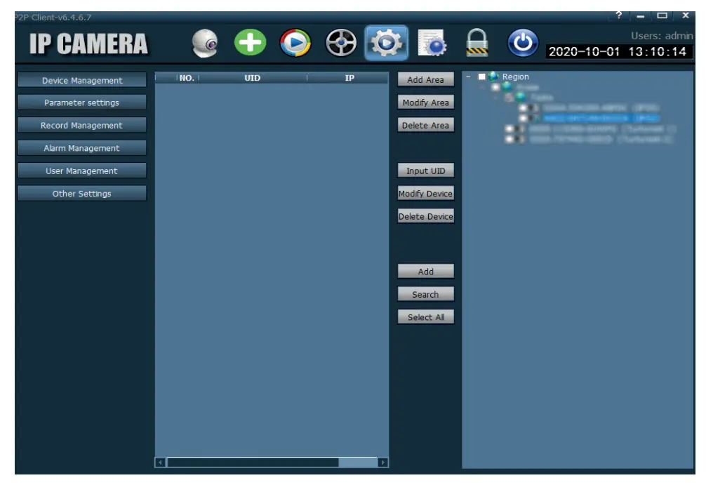 - Launch the application, access the Config menu, select or add the new area (Add Area) and add the camera using the UID ID on the camera label or on the phone, if it is already added. (Input UID) or looking for the camera connected in the same network as the computer: press Search.