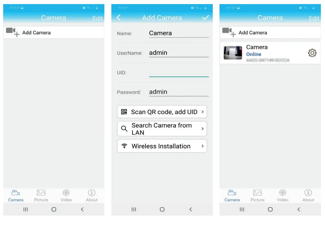• Scan the QR code on the label stuck on the camera (Scan QR code, add UID) - After you have successfully added the camera, click on the camera in the list to view the images taken by it in real time.