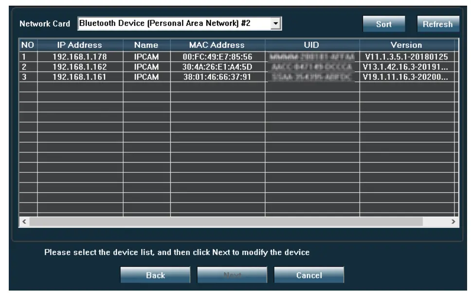 the camera connected in the same local network. - From the displayed list, identify your camera by UID (see camera label).