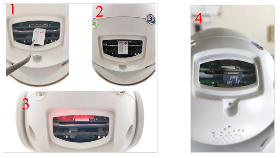 - Open the cover on the back of the camera. Install the Nano SIM card and the micro SD card (maximum 128 GB) into the camera.