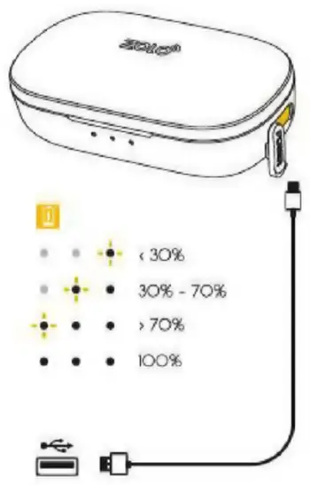 Pred prvním použitím plne nabijte sluchátka v nabijecim pouzdre. Uroven nabiti baterie a stav nabijeni viz nalevo