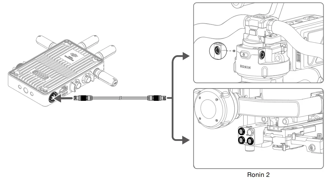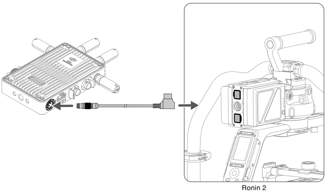 Connect the 14.4V accessory power port on the power hub or the port above the pan motor of Ronin 2 to the DC-in port on the video transmitter for power supply from Ronin 2.