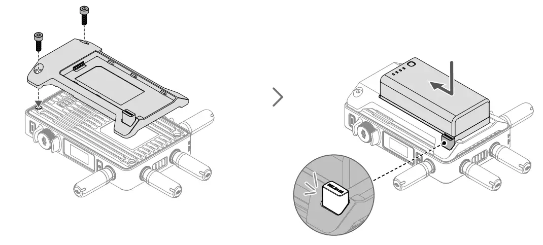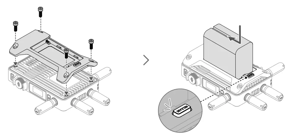 - Mount the WB37 battery adapter (TX) to the back of the video transmitter and tighten the two M4×12 screws.