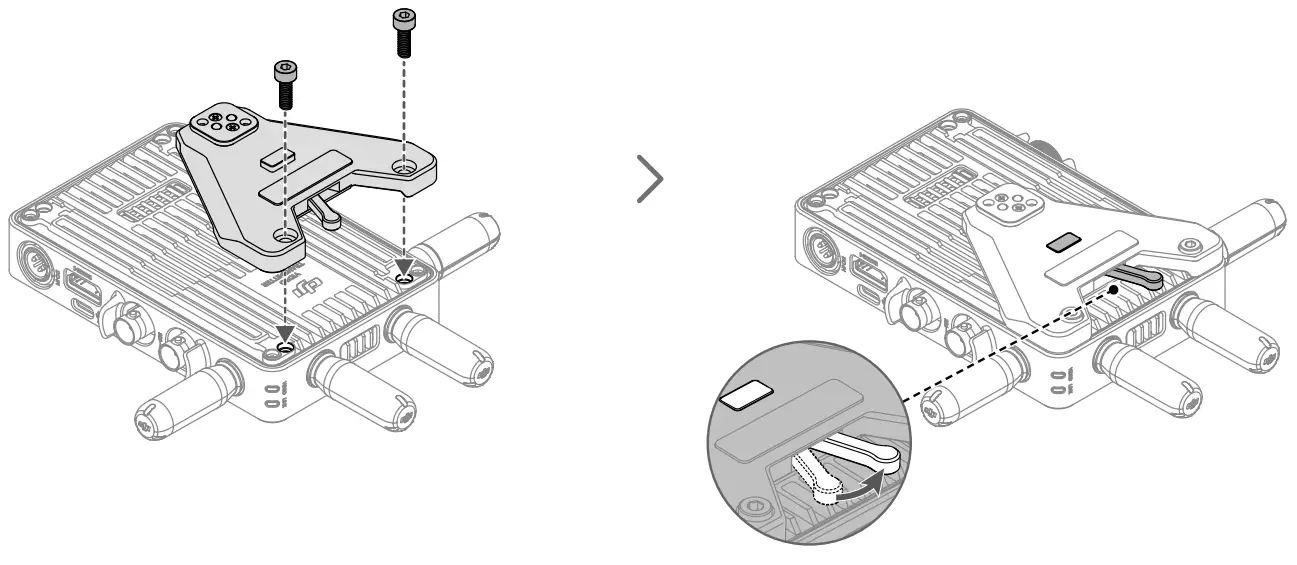 - Toggle the lever on the gimbal mounting plate in clockwise to lock the video transmitter