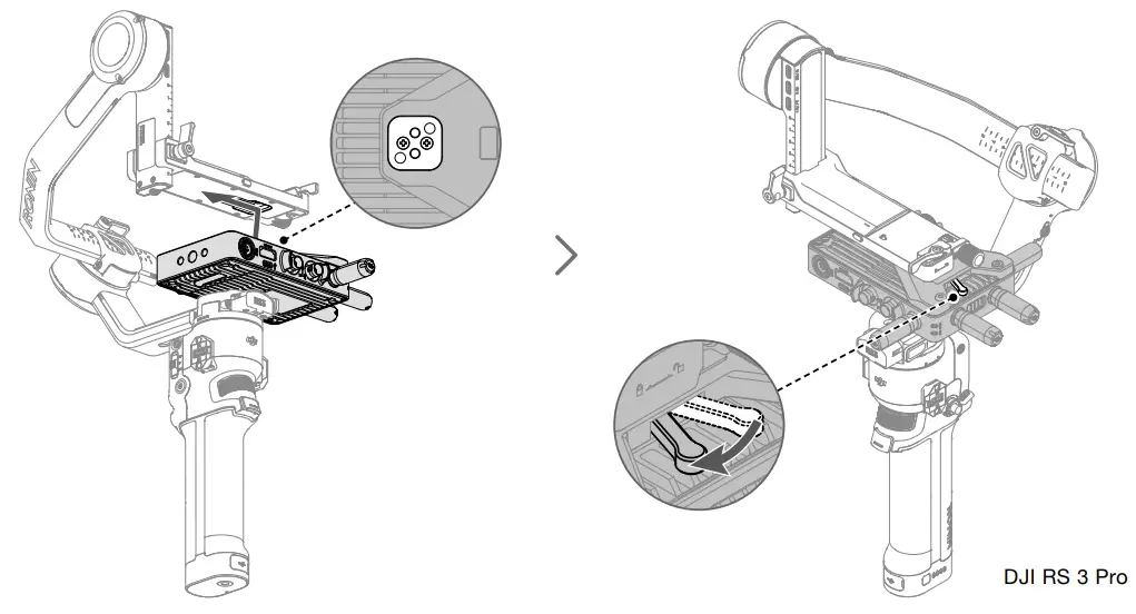 - Connect the cold shoe on the gimbal mounting plate to DJI RS 3 Pro.