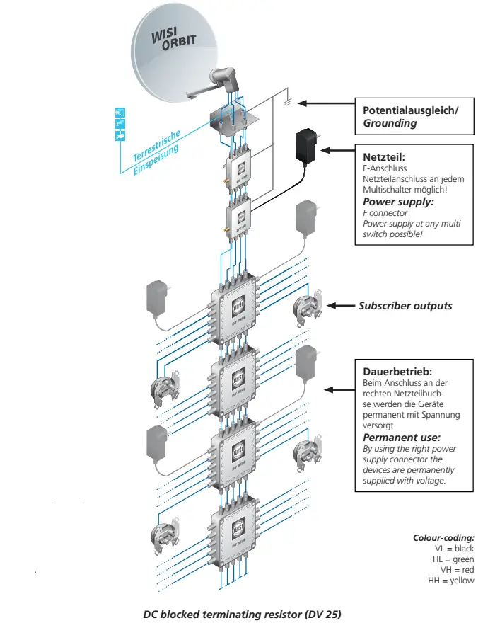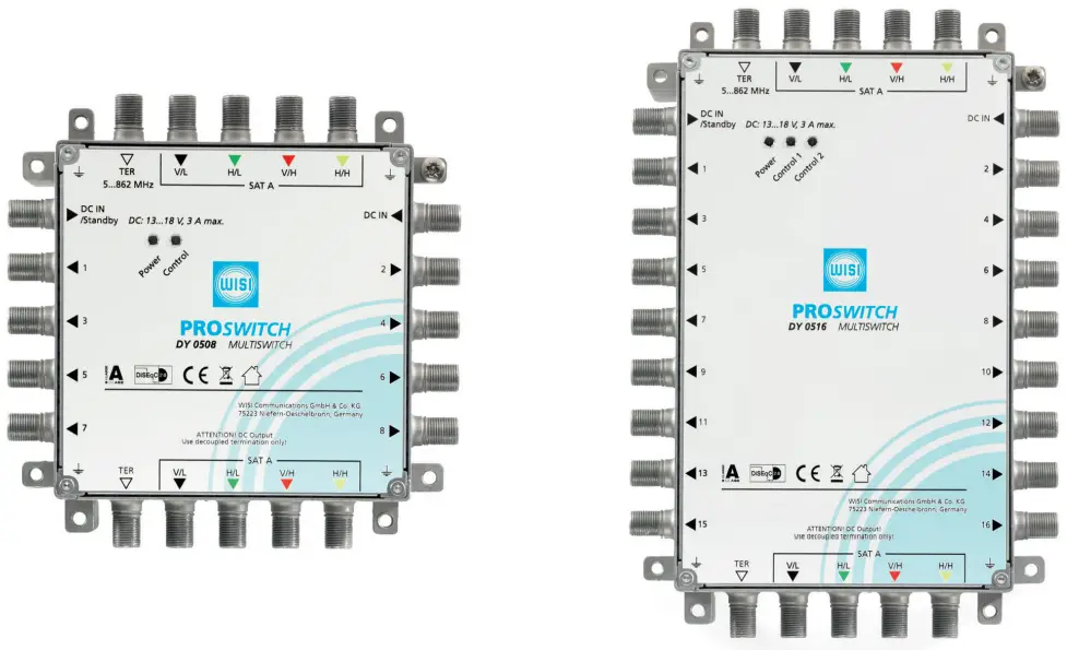 The DY types can be powered by the external power supply unit DG 55 or through SAT–trunk lines from connected multiswitches or amplifiers (please consider total current consumption). DC-blocks has to be considered to avoid power conflicts.
