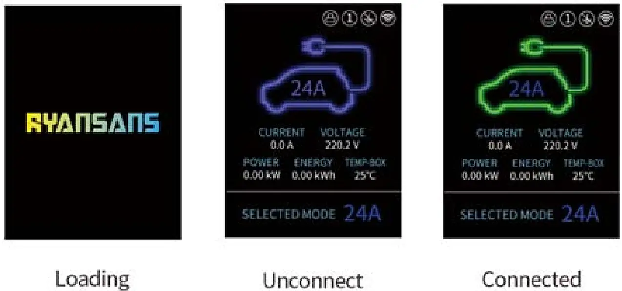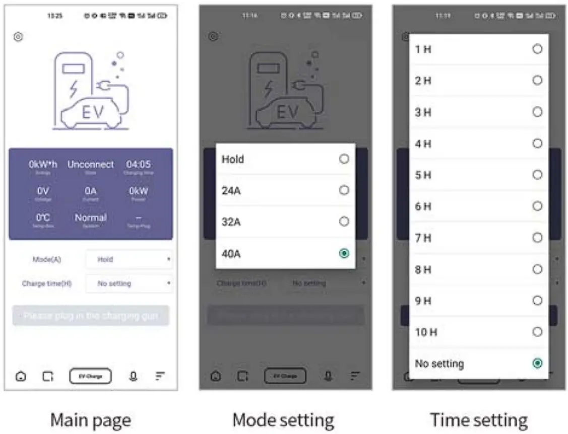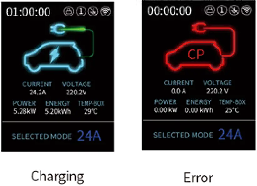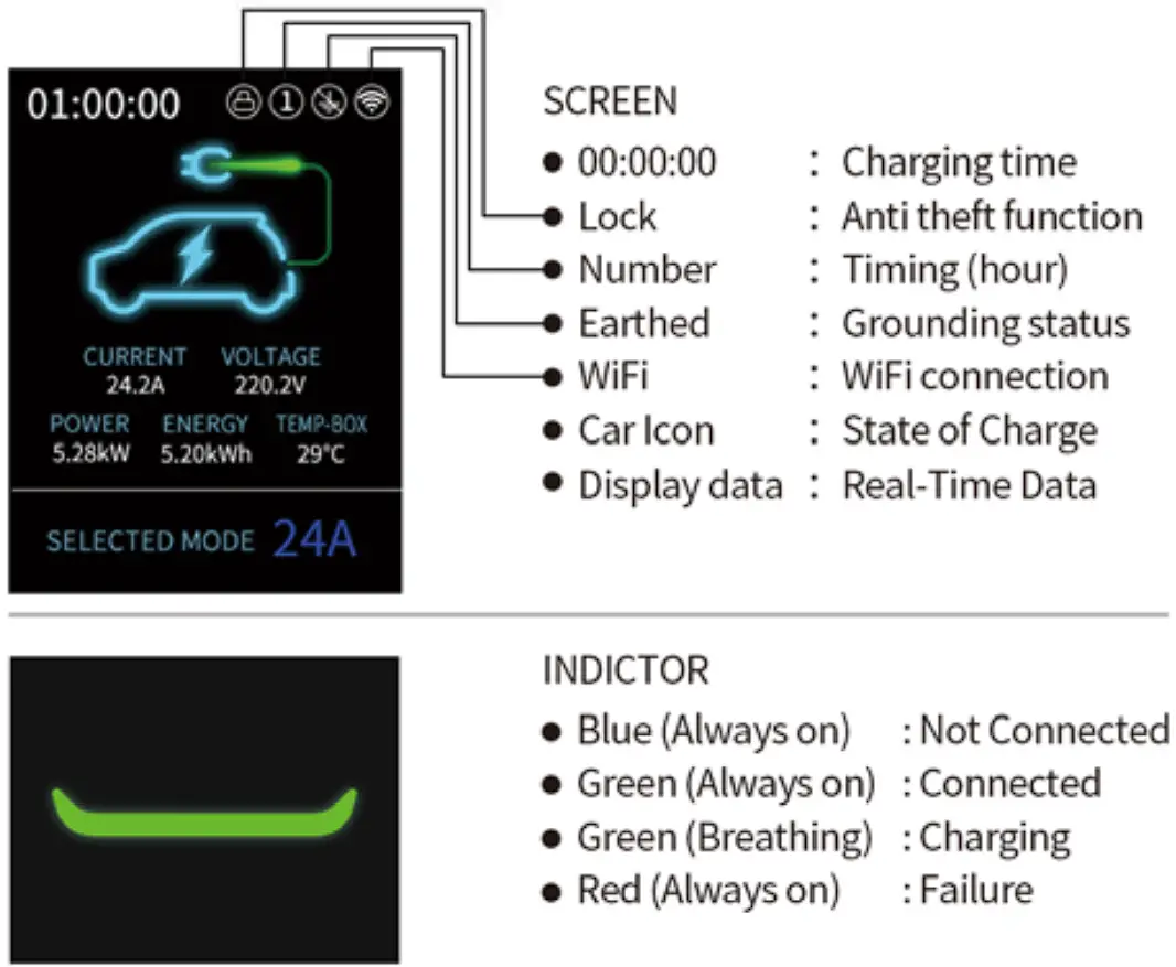 - The 40A device support 3 current switching mode of 24A/32A/40A. (Current switching numerical change in real time.)