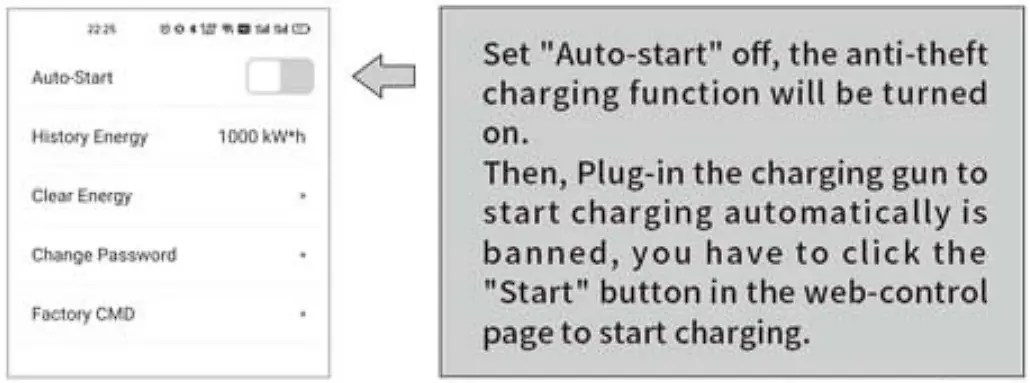 Ensure the charging gun’s head is fully inserted unt il it’s locked. - The device starts charging automatically. (If the “Auto-start” button in the web-control page is turned off, you have to use the web-control page to start charging, which is the anti-theft charging function. See page 13.)
