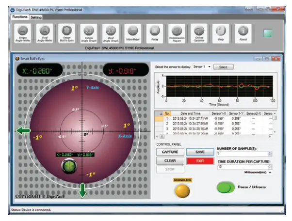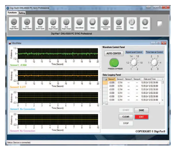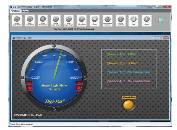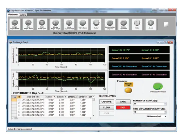 - Graphical and numerical display for real-time single-axis or dual-axis angle readings of multiple tilt sensor modules