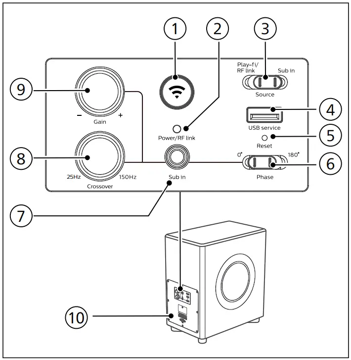 ② Power/RF link indicator 3 Source (switch Play-fi/FR link/Sub in mode)