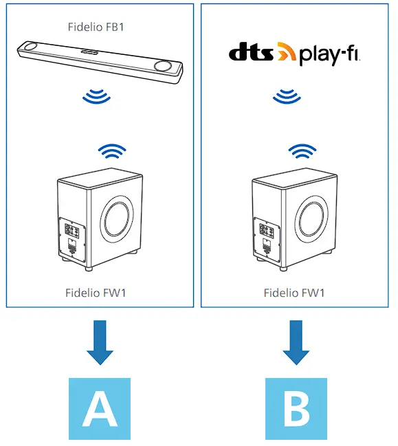 • When FW1 is used as a Play-fi subwoofer, source switch must be at Play-/RF Link position.